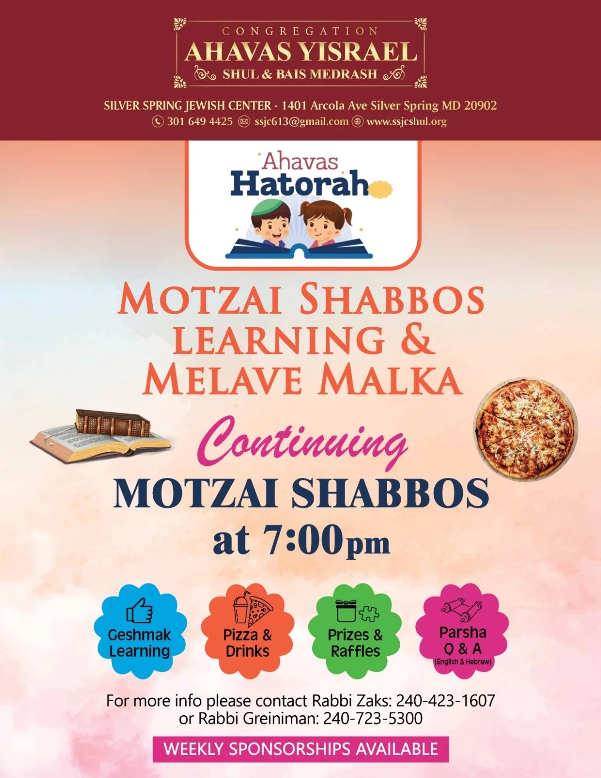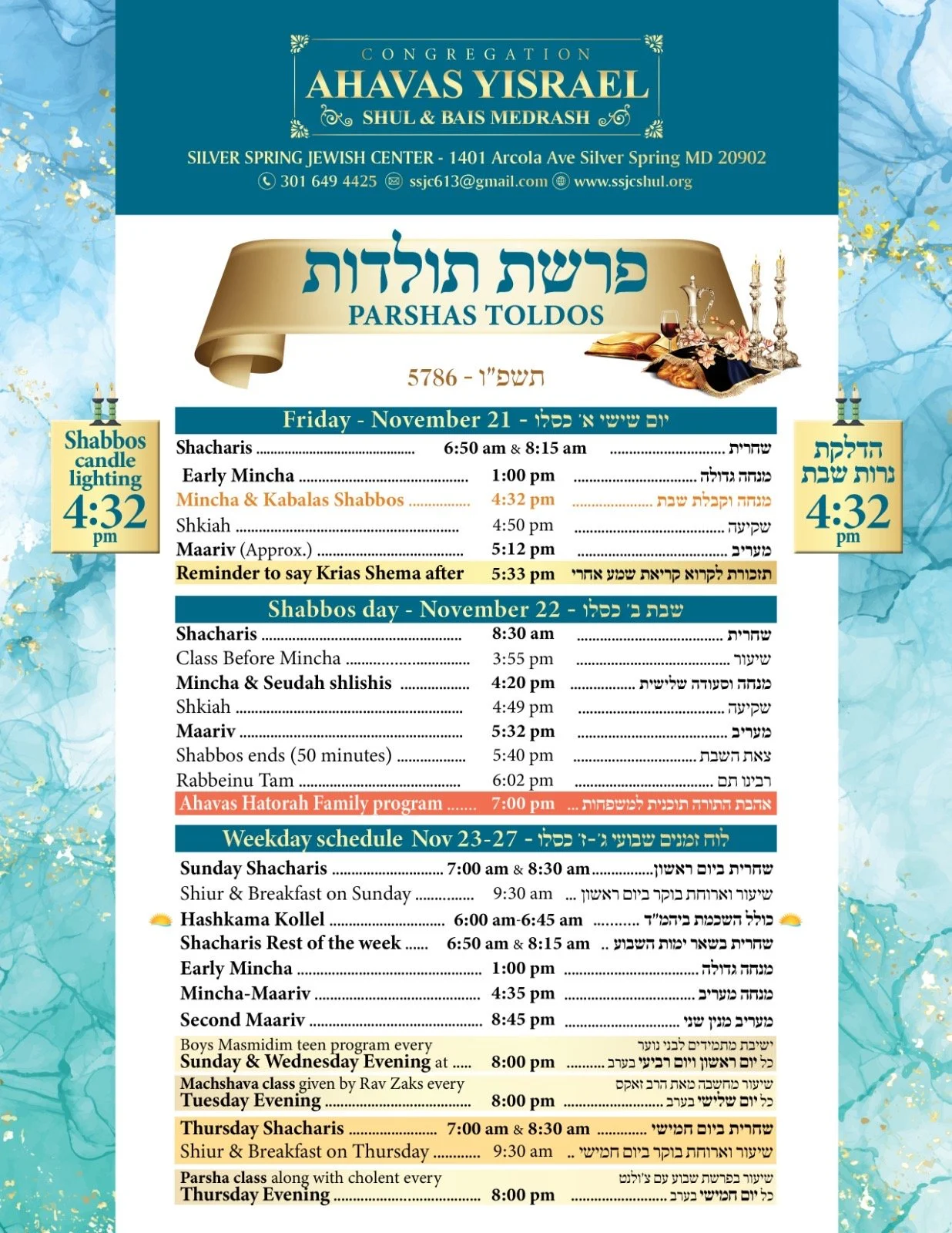 The Silver Spring Jewish Center community welcomes you to join us for Shabbat. Our shul is spacious and heimish, and the davening of the tzibbur is united and focused. One of our Rabbis inspires the kehilla with drashos between Kabbalos Shabbos and Shabbos Maariv on Friday night, and also after mussaf on Shabbos morning. Shabbos morning davening is followed by a sumptuous kiddush and a full seudah shlishit is available every Shabbos.